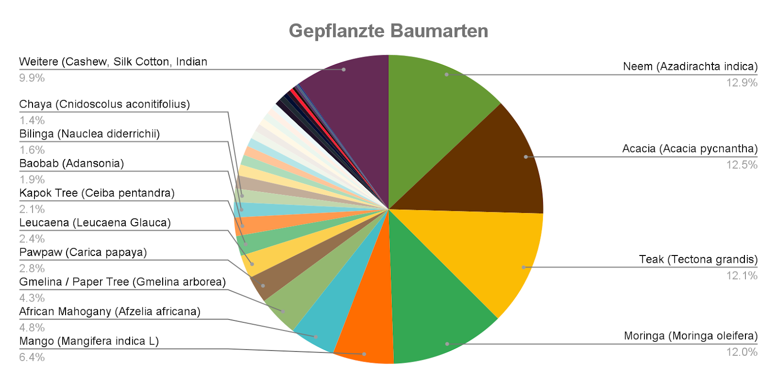 u.A. Moringa, Baobab (Adansonia digitate), Teak (Tectona grandis), Akazien (Acacia pycnantha), Sheanussbaum (Vitellaria paradoxa), Niembaum (Azadirachta indica), Mahagoni (Meliaceae).